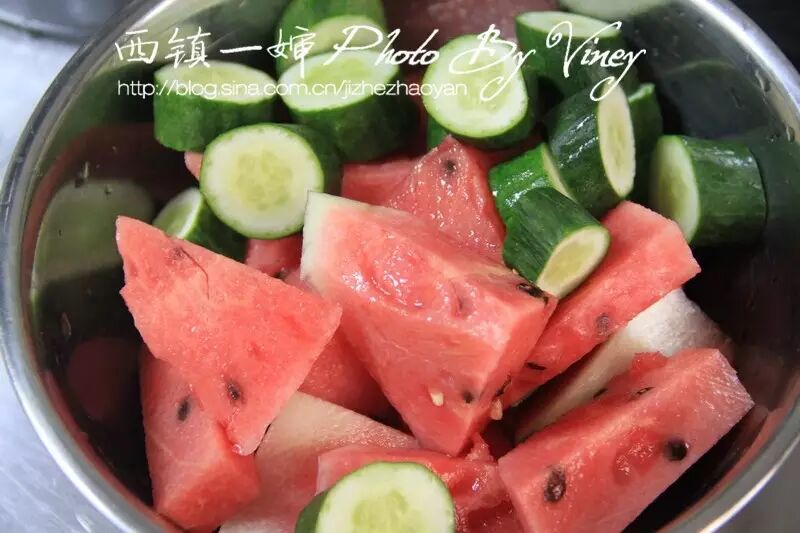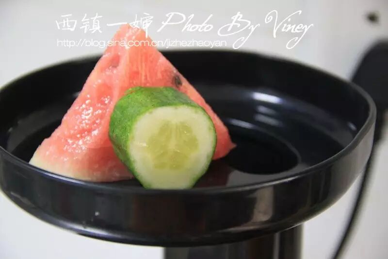1、先将西瓜去皮留肉,黄瓜洗净切段。因为瓜皮的白色部分有去火功能,所以我也保留了一点。黄瓜最好选用那种生吃味道也不错的,这样果汁出来才能味道最好。
