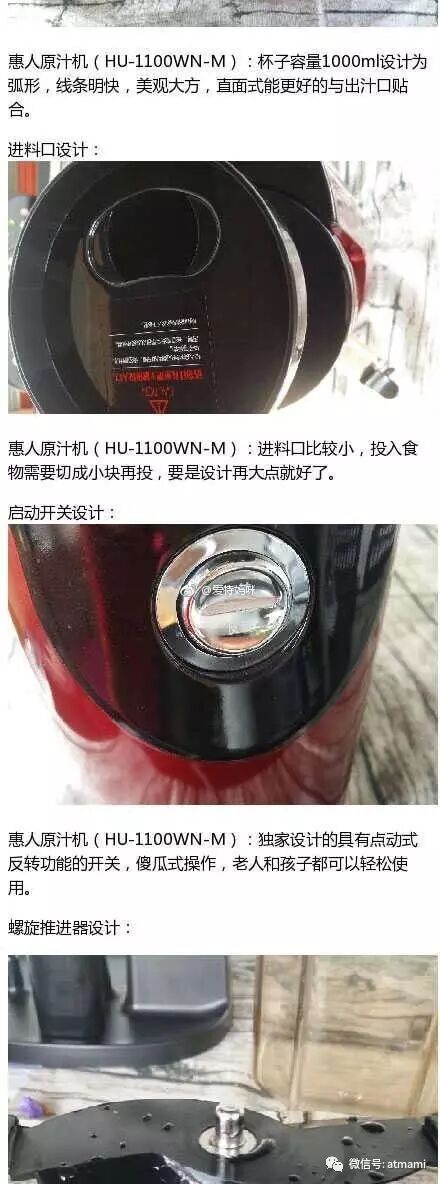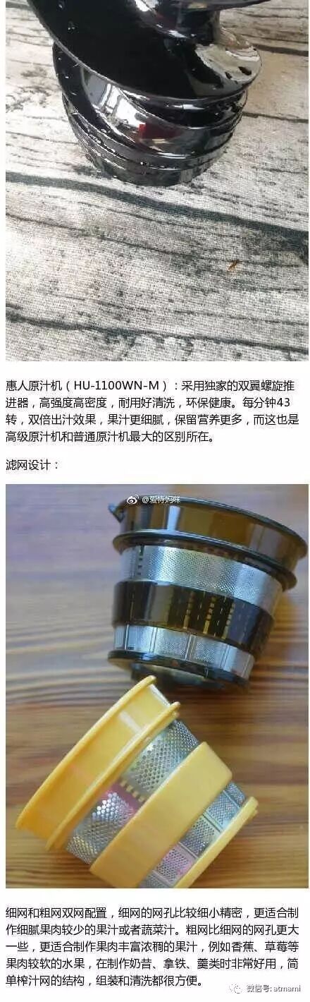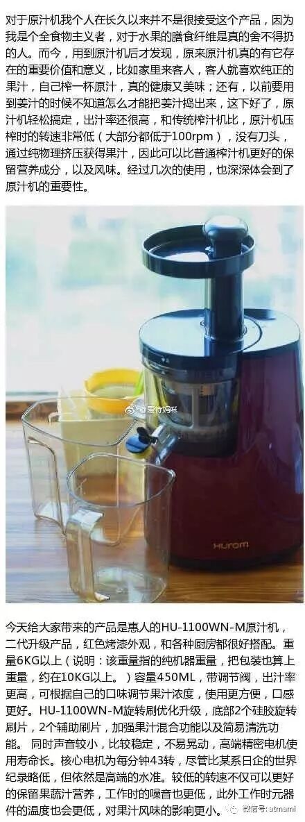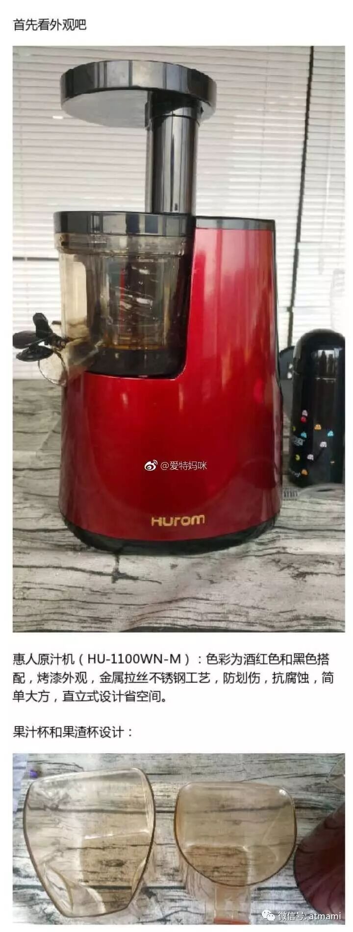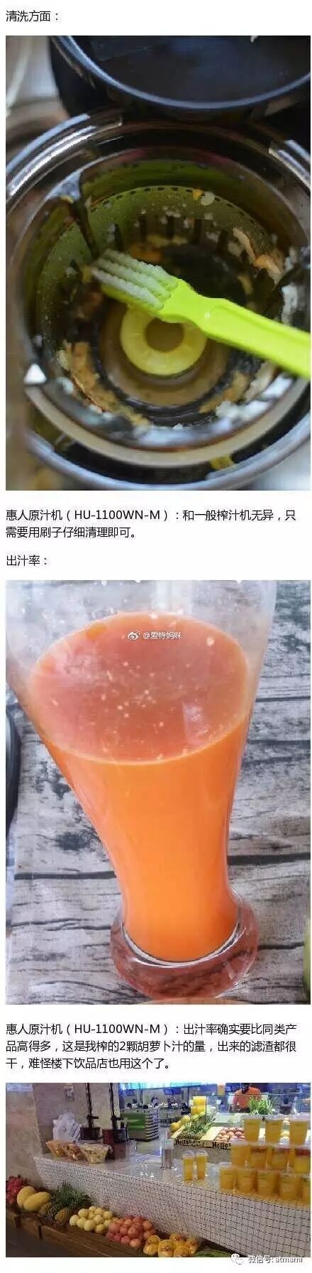 夏天这么热,自己在家榨一杯果汁,真是挺惬意的。说起榨汁机,大家都知道首选肯定是惠人。很多店里榨果汁都是用的惠人原汁机,出汁率高,操作简单。不过惠人的价格,也是让很多人下不了手。还好,我们弄到了同厂的私单!包装,配件,机器全部是原厂。我自己早早就收了一台,用了也有半年了。用下来的感受真的就一个字:值!几种水果榨汁,营养一步到位。老人孩子都爱喝。榨完的水果用手基本捏不出汁,非常干。完全不会浪费水果,现在水果真是够贵的!有人嫌清洗麻烦,其实用完了之后马上就清洗,非常简单快捷。这款型号大家可以自己去某宝搜,基本都是2000+,我们团880包邮。一年包换。