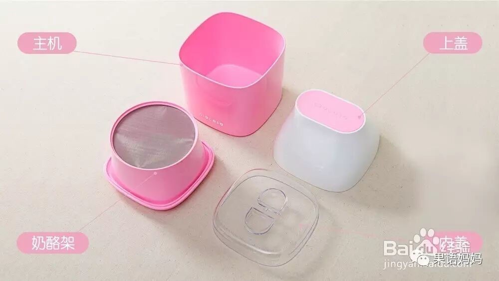 宝贝们每人吃了一碗酸奶,直呼好吃好吃!而且还要吃!那可不行,剩下的半罐我还有用处呢,我决定让它们升级成奶酪。对,你没看错!这是个套装产品,还有一个奶酪机呦!我把宝贝们安顿睡熟了,我开始研究奶酪机。奶酪机的外形与酸奶机酷似,一样萌嫩,只是更加小巧可爱。奶酪机的配件非常简单,包括主机、奶酪架、内盖和上盖,结构一目了然。