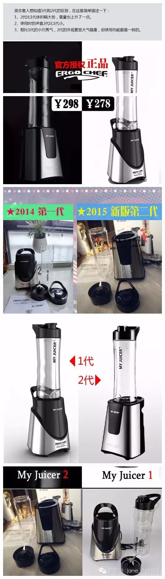 2015年,ErgoChef My Juicer 2 is coming!第2 代外观由德国名设计师设计,更加美观大气稳重;在转速不变的情况下,功率由300W调为250W,电机负苛更少,使用寿命更长;开关由原来的按压式设计改为旋钮式设计,操作更方便,更安全;插头由出口圆形插改为方形插,说明书也在纯英文版的基础上加了中文版,更加方便中国消费者。