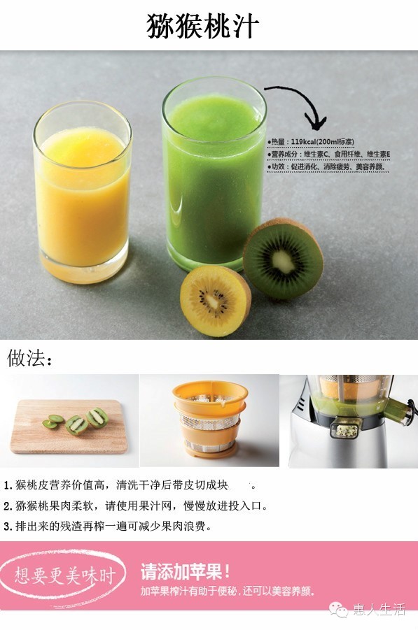 猕猴桃是长寿果,在日本曾号称吃一个可活一千年,虽然说的有点夸张,但也说明吃猕猴桃有很多好处。它的营养素如维生素C、维生素E、钾、钙、镁、叶酸、维生素以及各种抗癌物质,在猕猴桃中的含量要远远高于其他的水果。今天我们就用猕猴桃做一款——猕猴桃惠人汁。