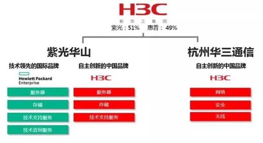 2015年9月,紫光华山成立,紫光华山是HPE品牌服务器、存储及相关技术服务在中国市场的独家提供者。而在即将成立的新华三集团中,紫光股份占股51%,HPE占49%。这宗交易完成后,紫光华山与杭州华三通信将成为新华三集团下属公司。在业务分布上,紫光华山是HPE品牌与H3C品牌服务器、存储及相关技术服务在中国市场的独家提供者, 华三通信是网络、安全、无线及相关技术服务的提供者。