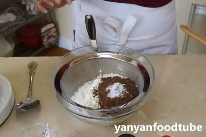 3.低筋粉、可可粉、泡打粉和盐过筛到一个大碗里。