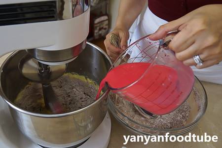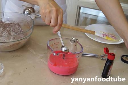 4.把食用色素和香草精倒入Buttermilk里然后搅匀备用。