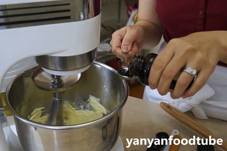 3.把过筛的糖粉一勺勺的加入正在搅拌的厨师机内,此时速度要低速。