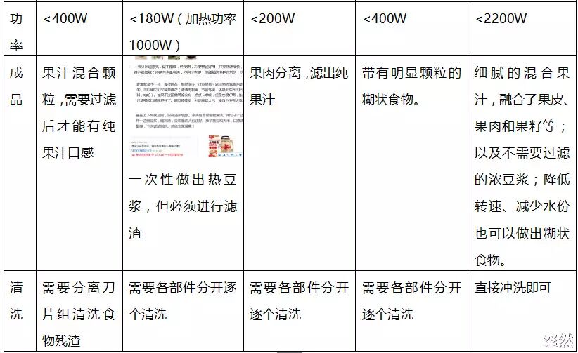 从以上对比表可以看出来,破壁机的功率是最大的,其与杯壁扰流技术配合,因此混合粉碎的效果最好,口感醇和细腻,可以最大程度地保有食物的膳食纤维;而且清洗也是最方便的,完全不用拆开各个部件,整个杯体直接用清水冲洗即可。