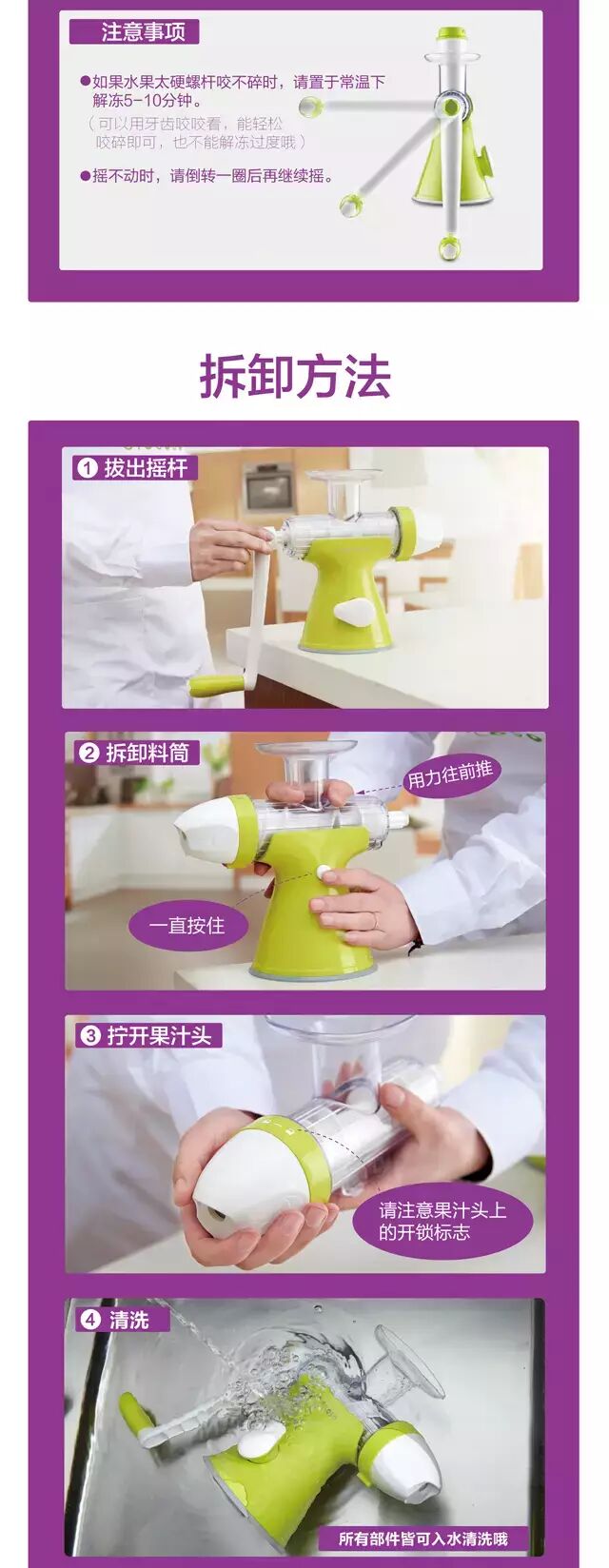 果语儿童原汁机充分了解“安全无毒”对孩子的重要性,所有与食物接触部分的材料都十分考究嗯,全部采用100%食品级材质,并通过了德国LFGB、美国FDA的严苛检测,在保证产品质量安全的同时,兼顾了外形的美观和良好的实用性,确保榨出妈妈放心的纯天然果汁,而且可以满足小朋友对果汁小量多样的需求。