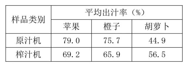 原汁机样品中,苹果、橙子、胡萝卜出汁率最大值分别为86.3%、79.8%、47.8%,最小值分别为71.5%、69.5%、40.5%。