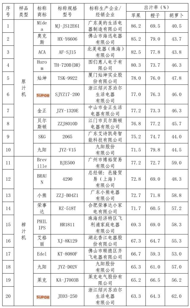 由于破壁料理机和搅拌机是将食物进行粉碎搅拌成泥状,因此本次比较试验仅对原汁机和榨汁机的出汁率进行了测试。