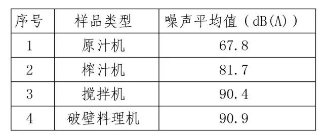 原汁机的噪声平均值为67.8 dB(A)(分贝)(详见表一),最高为75.4dB(A),最低为59.7 dB(A);