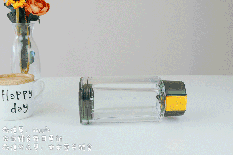 其次,用来做辅食泥的搅拌杯是高硼硅玻璃的,经常用来搅拌一些熟的、烫的食物,用玻璃的材质最安全放心,完全不用担心释放双酚A等有害物质。等大家收到实物后,可以感受下搅拌杯特别有质感。