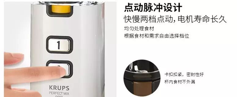 2. 通常普通的搅拌机,只有一个按键,但KRUPS搅拌机是两档设计,在使用过程中,可以根据需要来自由选择,想要搅拌得粗一点就用1档,细一点就用2档,有效地延长电机的使用寿命。