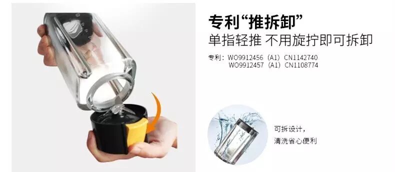 当用完需要拆卸时,不需要费力旋转打开,只要轻轻一推就开了,非常方便。不用担心机器在运行的过程中,因刀片的旋转而使杯体松动。也不用担心食材搅拌好后在旋转杯体时,因盖子没拧紧而使食材洒在机器内。