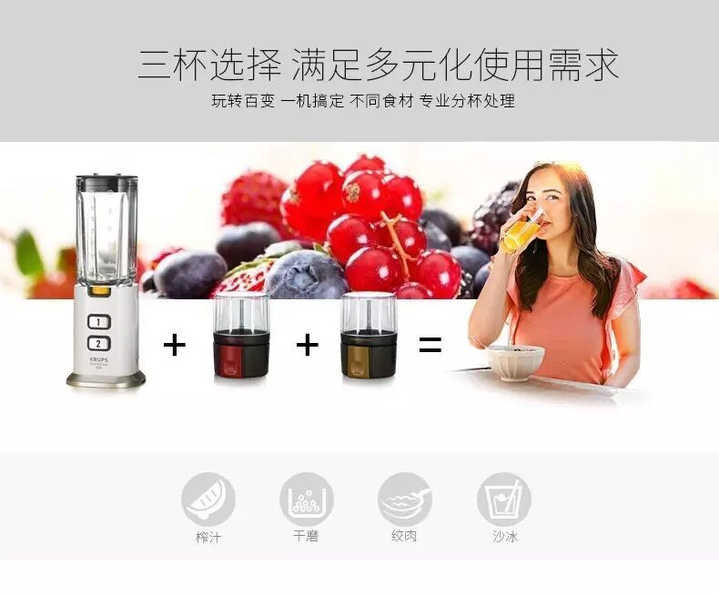 这款KRUPS搅拌机在多用途多功能、材质安全、搅拌的细腻程度、易清洗、使用便捷等方面都远远的优于其他普通类型的搅拌设备,价格方面自然也要稍微贵一些,但与其像我这样陆陆续续买了N多搅拌机、料理棒、榨汁机、破壁机,不如一次性买个功能全面,品质好的。