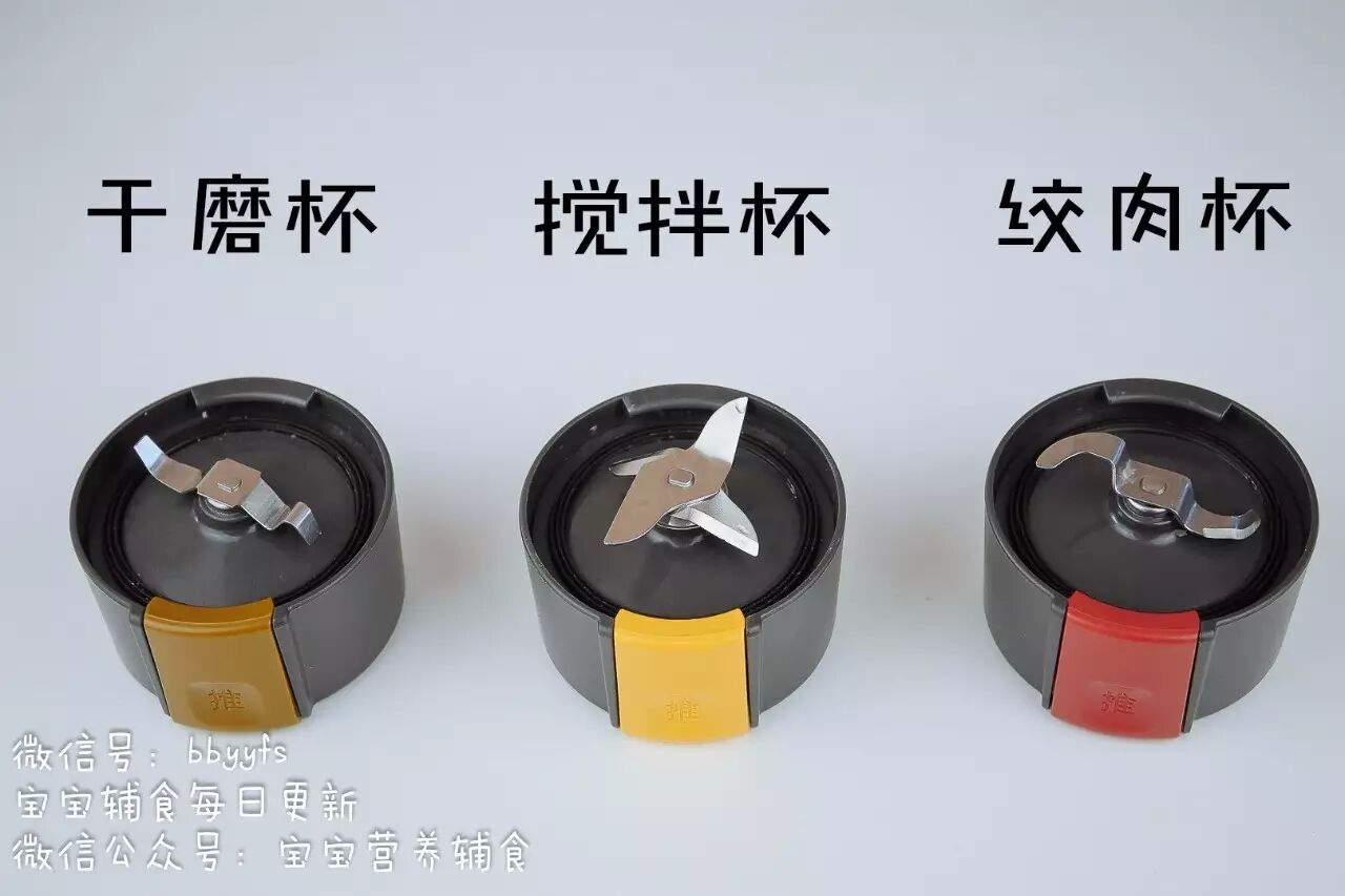 首先,它有三个搅拌杯,可以做到生熟分开。绞肉、做辅食泥分别用不同的杯子,而且还多了一个磨干料的干磨杯,给宝宝制作芝麻粉、核桃粉什么的超轻松。