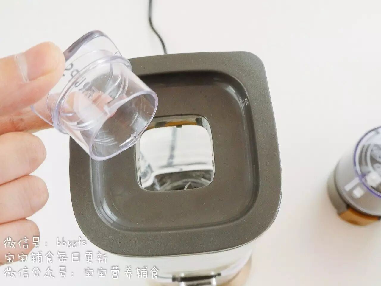 小思妈妈在这里要啰嗦一句,制作辅食的食物都是先煮熟或者蒸熟,然后放到大的玻璃杯中,记得一定要加水搅拌,才能把刀头带动起来哟~对于像鸡肉、猪肉、牛肉这样肉类辅食单纯地搅拌会比较粗糙,加点土豆、山药这样淀粉含量比较高的蔬菜就会搅拌得非常细腻了。