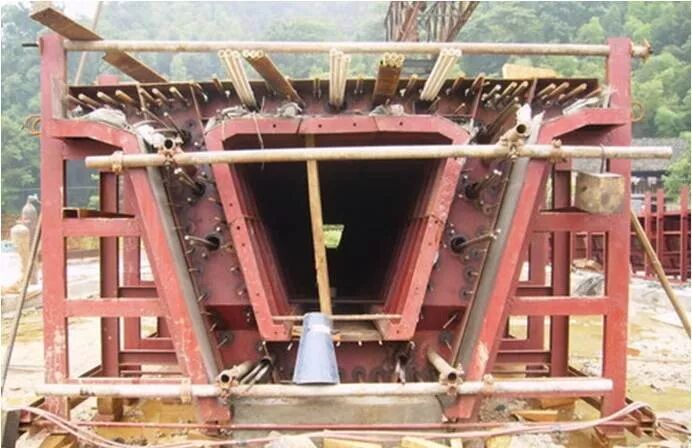 在现今桥梁施工中,常见的模板有木模和钢模。对于木模板而言,考虑到环境保护问题等,应尽量减少使用。对于钢模板而言,即可广泛使用。鉴于不同的桥梁结构,也有采用的是钢木结合模板、土模和钢筋混凝土模板等。模型类型的选择主要取决于同类桥跨结构的数量和模板材料的供应。