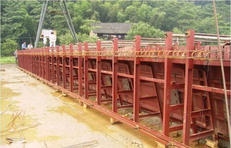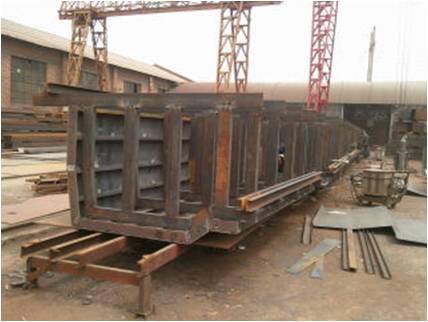 钢模扳一般都做成大型组件,一般长约3~8m,由钢板和劲性骨架焊接而成,钢板厚度为4~8mm。骨架由水平肋和竖向肋组成,肋由钢板或角钢做成,肋距为0.5~0.8m。