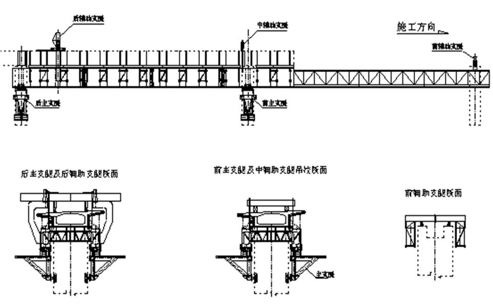 联合架桥机由一根两跨长的钢导梁、两套门式吊机和一个托架(又称蝴蝶架)三部分组成,导梁顶面铺设运梁平车和托架行走的轨道。门式吊车顶横梁上设有吊梁用的行走小车,为了不影响架梁的净空位置,其立柱底部还可做成在横向内倾斜的小斜腿,这样的吊车俗称拐脚龙门架。