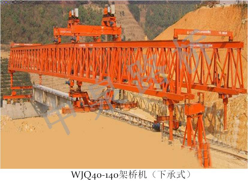 架桥机主要由两根分离布置的安装梁、两根起重横梁和可伸缩的钢支腿三部分组成。安装梁用四片钢桁架或贝雷桁架拼组而成,下设移梁平车,可沿铺在已架设梁顶面的轨道行走。两根型钢组成的起重横梁支承在能沿安装梁顶面轨道行走的平车上,横梁上设有不带复式滑车的起重小车。采用闸门式架桥机时的架梁步骤与用联合架桥机架梁时的操作步骤基本相同。用架桥机架梁适用于孔数多、桥较长、梁较长的桥梁。对于高空架梁法还可采用自行式吊车桥上架梁,吊车直接开到桥上吊梁就位,但此法必须核算吊车通行和架梁工作时已架桥孔主梁的承载能力。