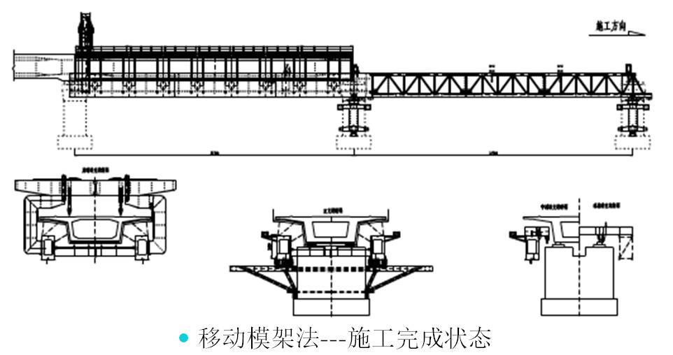 下承式支架较长,支承在前方桥墩及已完成的梁上,移动时可向前推进。