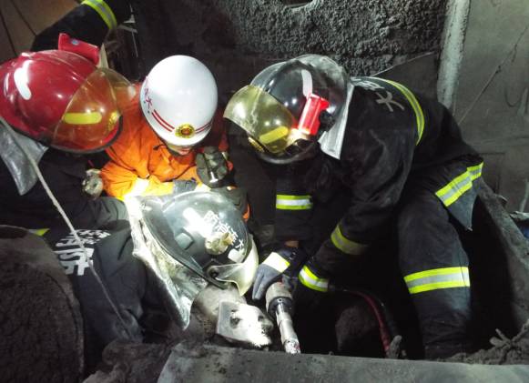 “如果用无齿锯正常切割,很快就能把遮挡物切除,但无齿锯工作时会产生大量火花、烟雾,一方面容易对被困人员造成二次伤害,同时也可能导致密闭的搅拌筒内缺氧。”张帅说,这种情况下他们只能放弃使用无齿锯,转而使用耗时比较长的角磨机,就这样经过将近一个小时的切割,救援人员终于将阻挡物全部清除,随后再使用液压顶杆进行扩张,扩大轮齿与筒壁间缝隙,最终成功将被困男子救出。