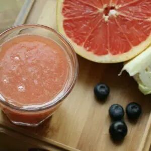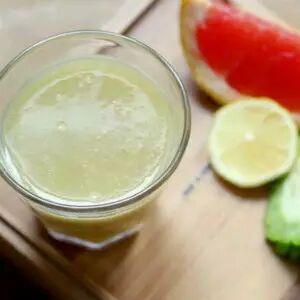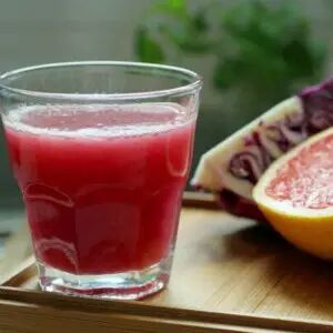材料:紫甘蓝芯1/4个,葡萄柚1/2个,黄瓜1/2根,梨1个,柠檬2片