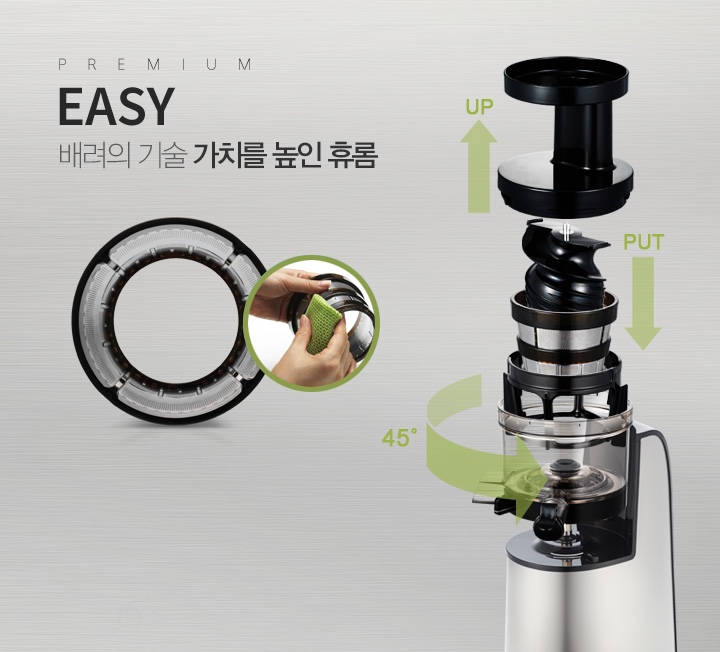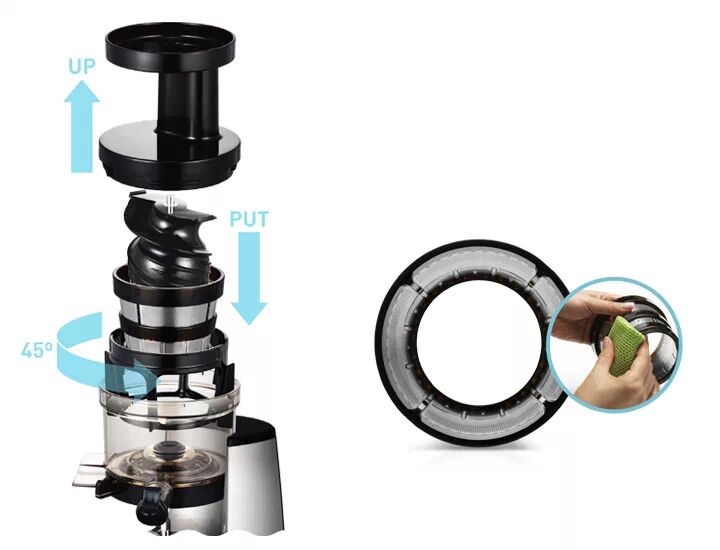 水果中含有大量人体所需要的各种营养,如果我们直接吃或者榨成汁的话它的效果分别会是什么样呢?如:老人或孩子吃一个大苹果会很困难,就算吃了也会产生饱腹感,而我们吃下去的这个苹果中的营养成分又能吸收多少呢?经临床验证,我们人体只能吸收全部营养的25%-30%,剩下的会随着人体的新陈代谢排出体外。相反,如果将一个苹果榨成果汁,人体吸收的营养成分将在65%-80%之间。液体有利于肠胃的吸收,这样我们喝新鲜自榨的果汁,就能从同等同量的水果中增加两倍以上的营养,这也是大家为什么喜欢喝果汁的原因所在。想要得到最多的营养成分,那么选择果汁机自然是最重要的。普通的榨汁机采用的榨汁方法都是刀头打碎,将水果打碎成汁,而且高速旋转,旋转速度达到每分钟8000多转,有的甚至高达12000转,大家都知道当速度特别快的时候必然是会瞬间加温,那么就在这个一瞬间,果汁中的营养成分会被瞬间氧化,营养成分大打折扣,这样不就正好违背了我们喝果汁的初衷吗惠人原汁机采用的是低速研磨技术,即SSS加工法,利用研磨技术榨出可口的健康原汁,之所以叫做原汁机,是因为它榨出的果汁原汁原味,惠人原汁机是告别了传统的榨汁方法,采用低速研磨,通俗点说就是采取我们古代使用的磨盘式的挤压,采用螺旋推进器,把果汁从水果中挤压出来,而且它的转速在每分钟70转,榨汁过程中不经过高温,所以果汁中的营养成分不会流失,可以使人体更大程度上吸收其中的维生素1)相信大家都看到过市场上普通榨汁机所榨的果汁,果汁在容器里会明显分层,出现上下两层,这就是果汁的纤维组织被破坏了。2)细心的朋友会发现,当你喝高速榨汁机所榨的果汁时,你会发现有一种轻微的异味,那就是果汁经过高速、高温的一瞬间已经变质。普通的榨汁机每分钟8000转,惠人原汁机每分钟70转,那出汁率肯定不一样吧?我的回答是‘不一样’ 但惠人的出汁率更高,能达到95%。而且清洗也方便操作也简单,机器前体全部为可拆卸的,用水一冲就干净了