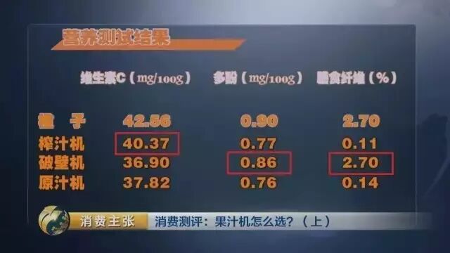 在维生素C的检测中,榨汁机优势明显。在抗氧化作用的多酚含量检测中,破壁机占有优势。在促进肠道蠕动的膳食纤维含量检测里,依然还是破壁机取得第一。而之前在口感盲测中取得第一名的原汁机,竟然在营养测试中表现最差。