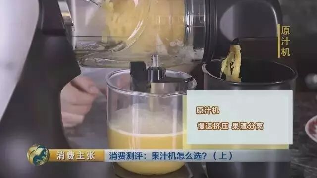 原汁机是很慢地把水果挤压出来,通过排渣口把果渣分离出来,而果汁是从另外一个出汁口流到杯子里的。