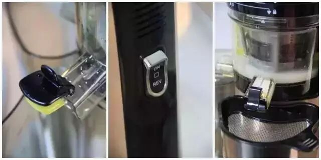这个机器的入口处有大口径设计和普通进口设计两个,大口径有一个专门的卡槽。将开关掰过去后,就形成了一个螺旋设计,可以将整颗苹果放进去然后用螺旋设计推送至螺旋杆处,十分安全不伤手。我整个拳头都可以塞进去,大家感受下。