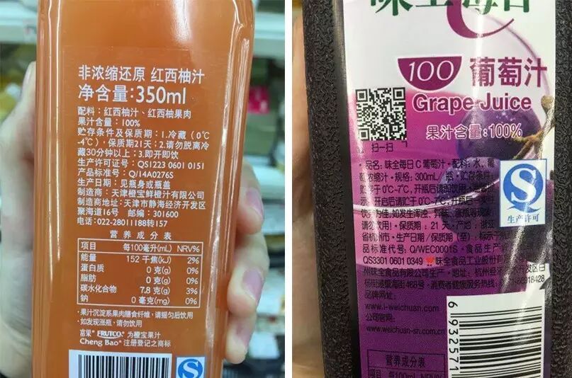 同样是标明果汁含量为100%两种果汁,为什么左边“非浓缩还原果汁”的配料表里排第一的是红西柚汁,右边配料表里排第一的却是水?还记得我说过的看配料表的原则吗?什么在配料表里排第一,什么就在里面占最多的比例。
