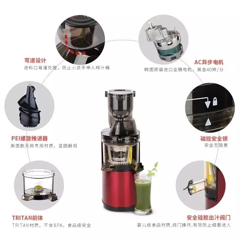 这个原汁机在我家差不多用了两年,别的都挺好,唯一麻烦的就是需要把水果切成小块,然后清洗起来有点麻烦。不过跟能喝到鲜榨果汁的幸福感比起来,这点小麻烦也就不算啥了。后来我爸爸身体恢复好了,就把这台机器送给我爷爷去用了,老人家牙口不好,特别硬的水果也吃不了,这个原汁机就很适合了。今年夏天到了,我就又开始琢磨着找个靠谱的原汁机自己用,上网一搜发现,现在可选择的余地可比3年前多多了。挑来挑去,我选了下面这个:韩优PU-B008家用大口径原汁机
