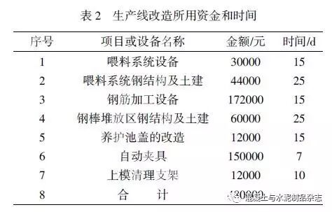 经改造后,生产过程中原材料的浪费大大降低。原先每班每天倒掉的报废混凝土一般有5t装载机1~2 斗,现在只需人力小车1 车。改造后的综合制造费用比原先要下降3~4 元/m,按单班年产量60万m计算,年节约180 万~200 万元生产成本。