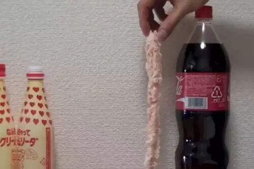 然后把曼妥思之枪强行塞入可乐里,盖上瓶盖,可乐立刻像喷泉一样往外喷射。一般人看到这种情况,第一反应会是——躲!