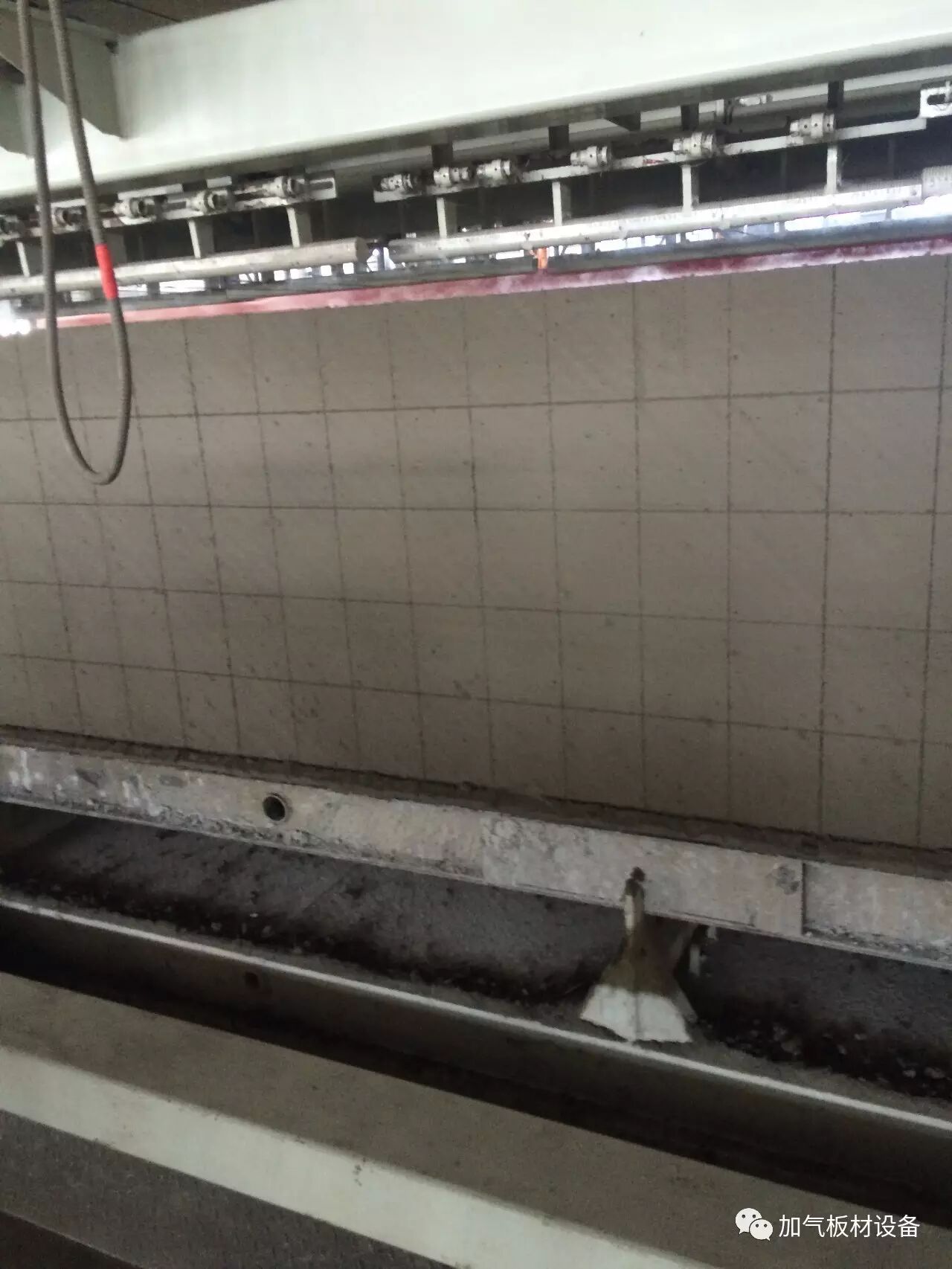 静停初养达到切割强度后,由切割线脱模行车(10t+10t)上的专用吊具吊运至切割机翻转台,脱模使用坯体平放。翻转台翻转,切割装置行走进行纵切和横切,完成切割。