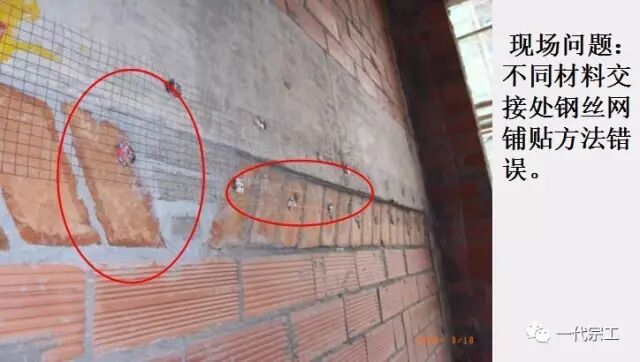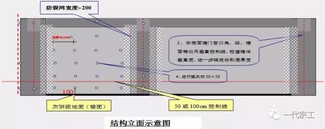 抹灰前必须在不同材质的界面(结构柱、构造柱、梁与墙体连接处)需要补强处理,一般采用抗拉防裂网进行,如上图。防裂网固定采用钢钉加铁片进行,竖向间距一般为150mm,必须紧贴墙面固定牢固。