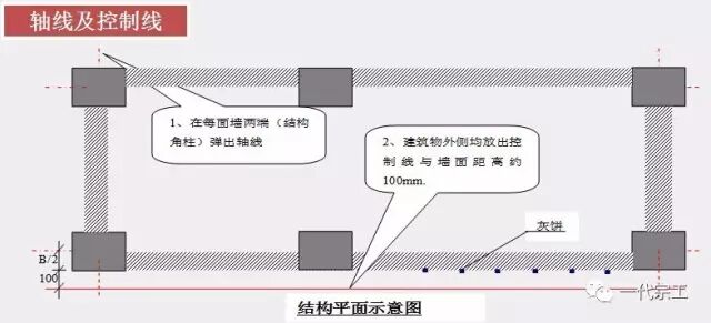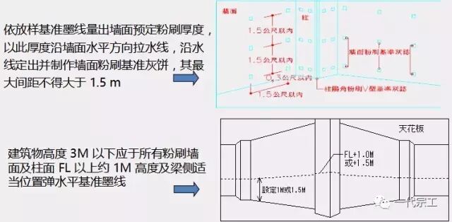 ② 室内墙面抹灰前应对房间方正尺寸进行检查,根据偏差值,在踢脚线(距楼地面150㎜)位置打粑@2000㎜,再复查房间抹灰打粑的尺寸,无偏差后依据打粑的实际厚度冲墙面抹灰厚度的竖向柱。