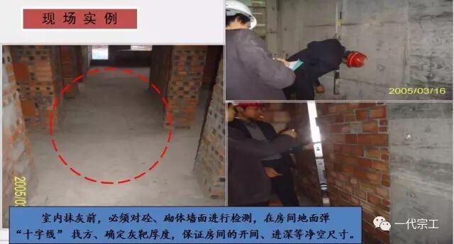 ① 室内抹灰前,必须对砼、砌体墙面进行检测,在房间地面弹“十字线”找方、确定灰靶厚度,保证房间的开间、进深等净空尺寸。