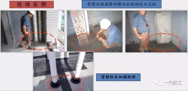 ② 套管与楼板、烟道与楼板的缝隙应用细石砼内掺微膨胀剂(板底撑模)捣实(分2次浇筑),缝隙≥50㎜应附设Φ6环形箍和板筋焊接,细石砼初凝后,蓄水养护不渗漏后再进行防水施工。