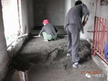 ⑤ 用铁锹铺细石砼,厚度略高于找平柱或墩,随即用铁筛子来回碾压,表面形成浆状为止,然后用手铁板赶压二遍,有坡度要求的应按设计要求坡度做。