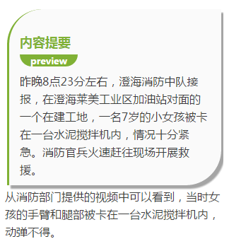 机器被关停后,小女孩被卡在了搅拌机内。消防官兵到场后,经过勘察和分析,决定用液压扩张器对这台搅拌机进行破拆,成功将这名小女孩救了出来。