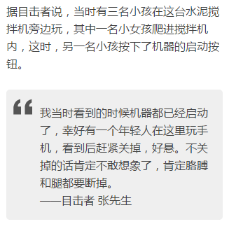 据了解,这名小女孩的父母都是河南籍的务工人员,外公外婆在当地开了一家面条加工店,周末,小孩来这里玩耍,由于家长一时疏忽,小孩子就独自跑到工地上去玩了。