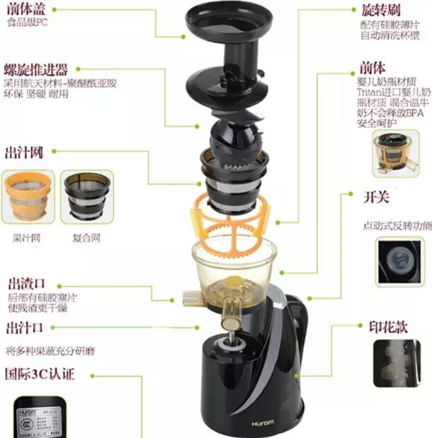 先来看看这款原汁机长什么模样吧?!如果对我们家机器进行过了解的话,大家就会知道这款有着非常与众不同的颜色哦!它的主体是钢琴黑烤漆的,非常经久耐用,而且看起来好酷炫有木有?!正面看一下!亭亭玉立,就像一只优雅的黑天鹅~好想抱回家啊!再看一下细节!真是油光水滑啊~主体上还有非常精致的印花哦!处处透着雅致!如此出色的外观当然也要配上出色的内在才行!来看一下原汁机分解图!每一个部件都采用精湛工艺制作,只有这样才能做到内外兼修!带给大家非一般的使用体验!在机器性能上,咱们惠人更是有几大不得不说的优势哦!PS:秒杀名额以系统显示的订单付款时间前三名为准!名单会在后续通告中放出!