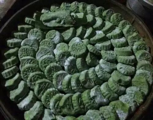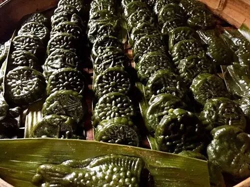 接着上蒸笼蒸。在灶司菩萨的注视下,往灶膛里加大的柴爿,将火添到最旺,待到大铁锅上的大蒸笼蒸腾起挥之不去的氤氲之气,盼望多时的清明节的美味也就出锅了。漂亮青翠的嫩绿积淀成沉稳透亮的墨绿。为了表示对祖先的尊敬,我们将第一笼的部分用来供奉他们,祈求先人们保佑后辈从钱财到学习的方方面面都能顺遂。