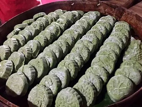天台冷食是吃清明饼。《天台风俗志》里记载:“采菁()作饼,以备寒食。”把菁洗净煮熟和糯米粉捣匀,用面杖压成扁圆形,用豆沙作馅,放进特制的模子里印出花样,蒸熟以后就成为形如碧玉的清明饼了,还有用笋末、肉丁等作馅捏成饺子的,叫清明饺。