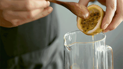 1.将百香果洗净切开,以汤匙将果肉挖出,放入果汁机中。