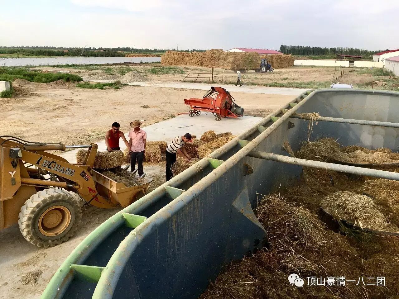 在详细了解机器的使用后,该团工作人员使用铲车将麦草、苜蓿、青贮、精料,按比例、顺序清倒在搅拌机内,通过机器的切割、粉碎,由传送带把搅拌均匀的精粗饲料装在车里,由工作人员运送到牛圈里。