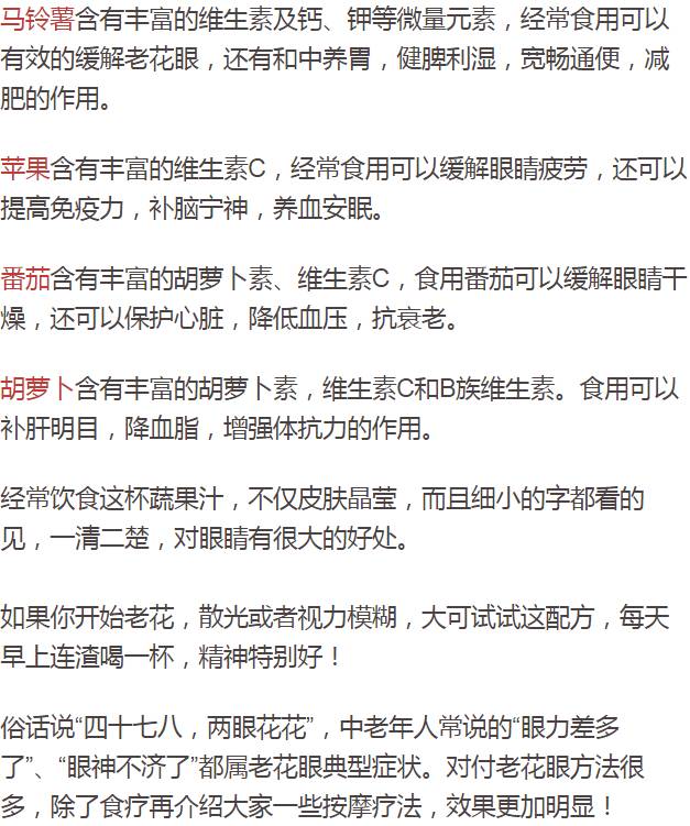 眼睛是心灵的窗户,每天一杯马铃薯苹果汁,再加上穴位的按摩,摘掉老花眼!这些简单的护眼方法随时随地可以做,您学会了吗?别忘了告诉身边的朋友们哦!